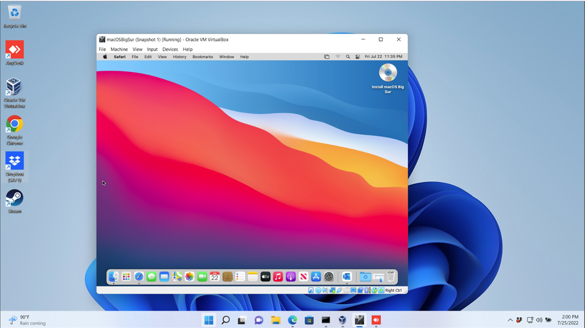 Here is a macOS VM running on Windows 11 using VirtualBox.